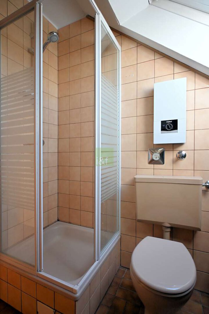 Tageslichtbad: Das Badezimmer ist mit einem Fenster ausgestattet und verfügt über eine Badewanne sowie eine separate Dusche. Die Fliesen stammen aus einem älteren Baujahr, sind jedoch gepflegt und funktional. Die Warmwasseraufbereitung erfolgt über einen elektrischen Durchlauferhitzer.