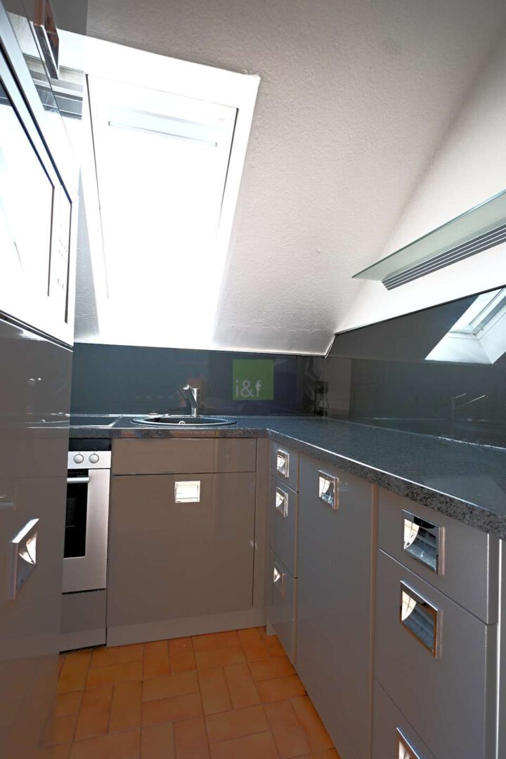 Die Küche ist zwar eher kompakt, aber clever geschnitten und voll ausgestattet mit einer funktionalen Einbauküche – perfekt für alle, die auf wenig Raum alles griffbereit haben möchten.