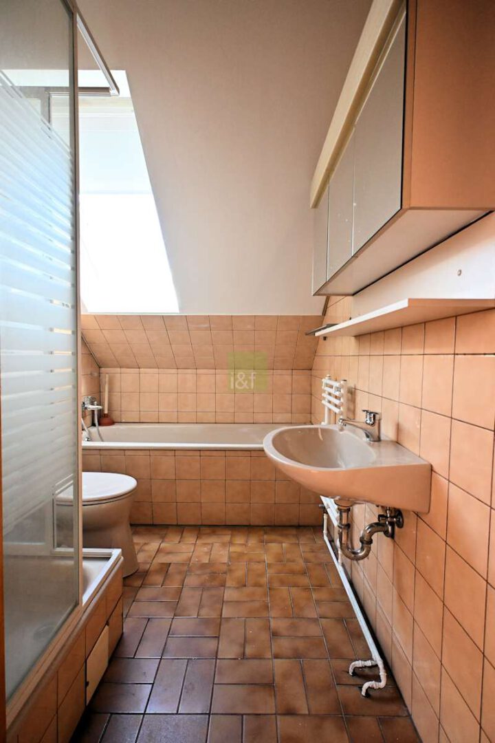Das Tageslichtbad ist gepflegt und funktional. Es verfügt über eine Badewanne sowie eine Dusche. Die Ausstattung ist solide, auch wenn die Fliesen nicht mehr dem allerneuesten Trend entsprechen – dafür punktet das Bad mit natürlichem Licht und praktischem Schnitt.